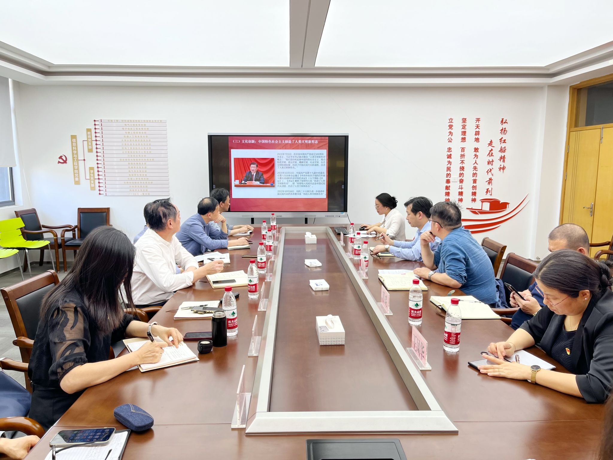 、信息科学与工程学院和继续教育学院党委理论学习中心组在悦礼楼505会议室开展联学活动,深入学习习近平文化思想,会议由信息科学与工程学院院长朱耀东主持。