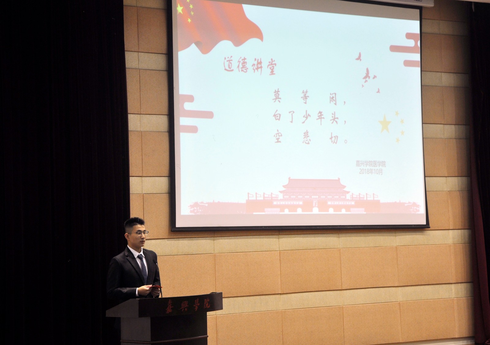 道德是人们共同生活及行为的准则和规范,是引导人们追求至善的良师。此次道德讲堂活动让师生们经受了一次灵魂的洗礼,提升了道德修养、内涵品性,使嘉医学子在今后能够更好的弘扬中华民族的优良传统,传播社会正能量,珍惜韶华,胸怀祖国,构筑祖国的宏伟蓝图。